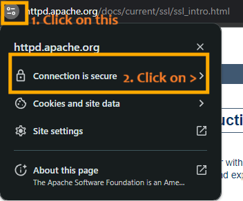 Before diving into SSL/TLS protocol stack, let’s have a look at terminologies that are of importance to understand the protocols. To check what fields are included in the Certifciate Viewer, go to the website you want to visit. And then Click on 1. If you hover over it, it says “view site information. After you click on it, you will see, “Connection is secure”. Click forward arrow >.