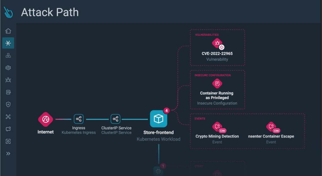 - Attack Path under Risks – it drills down into details and provide runtime event insights. For more, you can refer to this article, Unveiling Sysdig Secure Risks and Attack Path Analysis: Visualizing and Prioritizing Cloud Security Risks, by By Daniel Simionato, Sysdig.