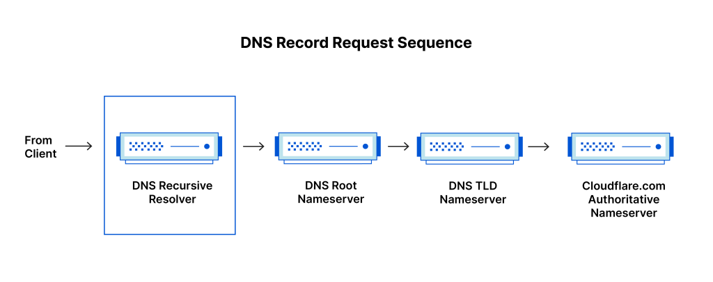 DNS operates as a distributed, hierarchical system. The process of DNS resolution involves converting a hostname into a computer-friendly IP address. When a client searches for a hostname—typically through a web browser—their network’s DNS provider executes a multi-step resolution process via the following four servers in order to find and return the appropriate IP address.