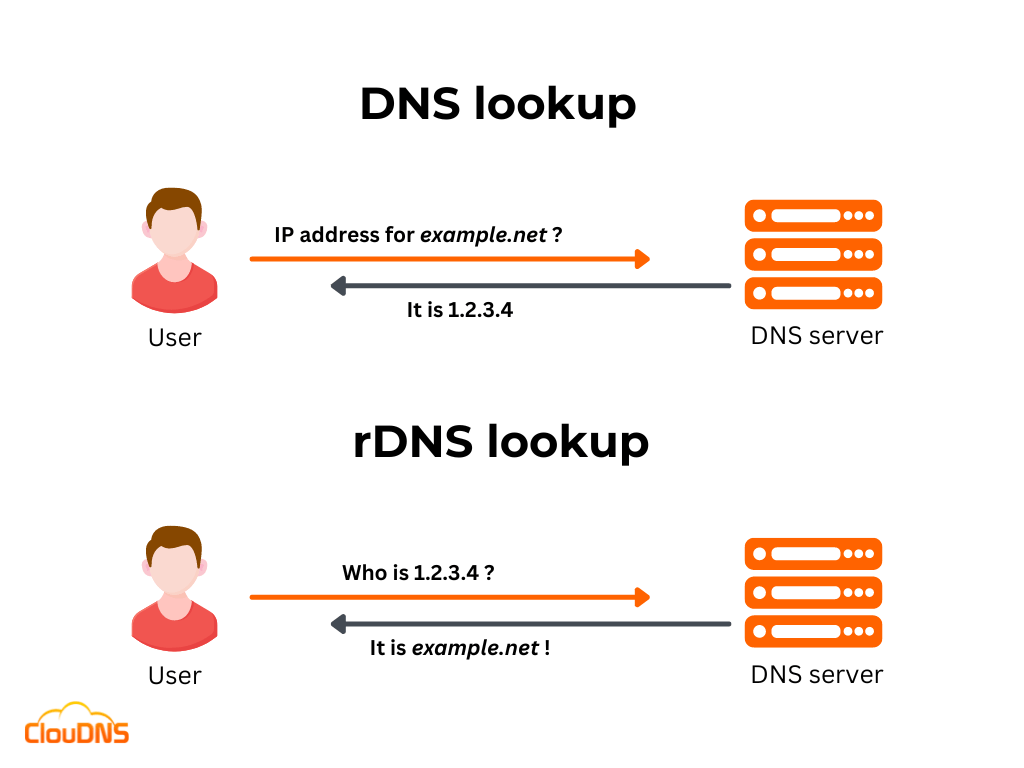 Image referenced from cloudns.net, https://www.cloudns.net/blog/reverse-dns-ptr-record/. For more detail about reverse DNS lookup, read the article from cloudns and Overview of reverse DNS and support in Azure, https://learn.microsoft.com/en-us/azure/dns/dns-reverse-dns-overview.