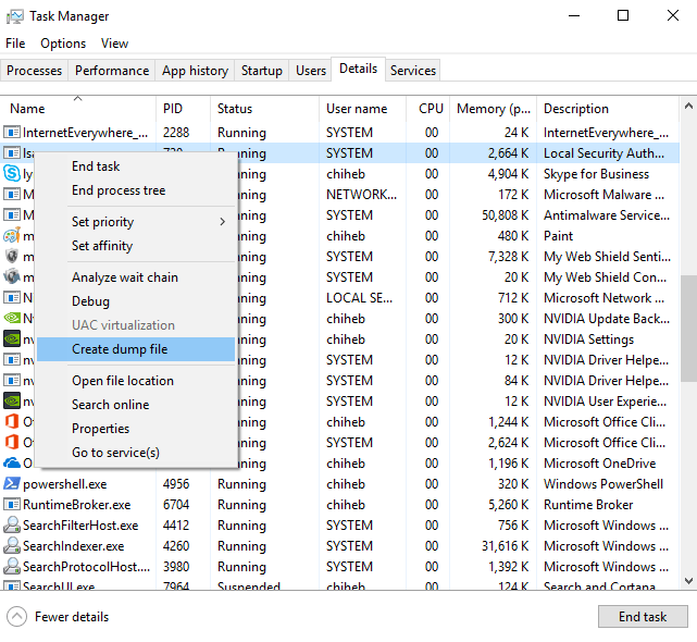 - The Windows Task Manager may be used to dump the memory space of lsass.exe to disk for processing with a credential access tool such as Mimikatz. This is performed by launching Task Manager as a privileged user, selecting lsass.exe, and clicking “Create dump file”. This saves a dump file to disk with a deterministic name that includes the name of the process being dumped.