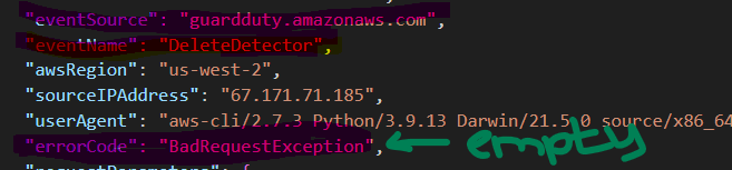 "userAgent": "aws-cli/2.7.3 Python/3.9.13 Darwin/21.5.0 source/x86_64 prompt/off command/guardduty.delete-detector",